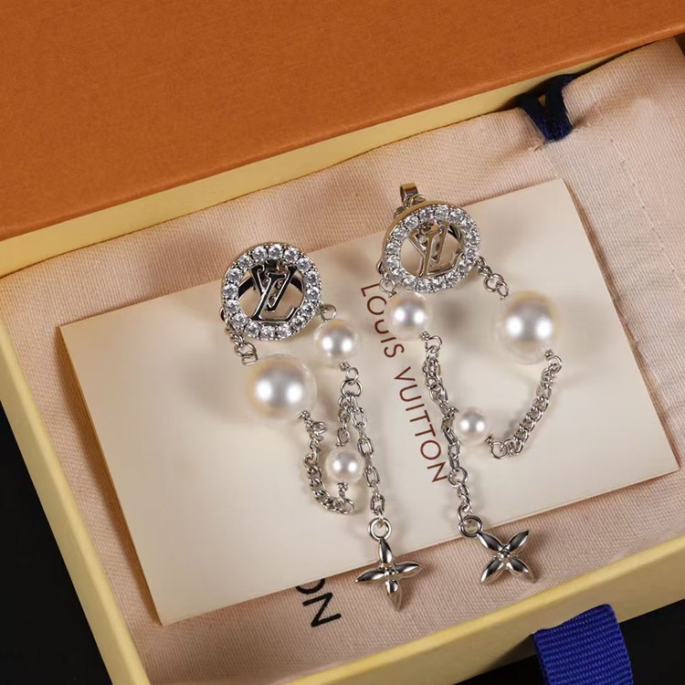 Louis Vuitton LV silver letter diamond pearl tassel earrings-3865